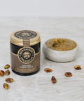 Zutaten: Pistazien, Mandelnougat (Zucker, Mandeln, Kakaobutter, Emulgator: Sojalecithin), weiße Schokolade (Zucker, Kakaobutter, Magermilchpulver, Emulgator: Sojalecithin, Vanille), Kadayif (Weizenmehl, Sonnenblumenöl, Salz, Konservierungsmittel: Kaliumsorbat), Sesammus (Sesamsaat), Salz.